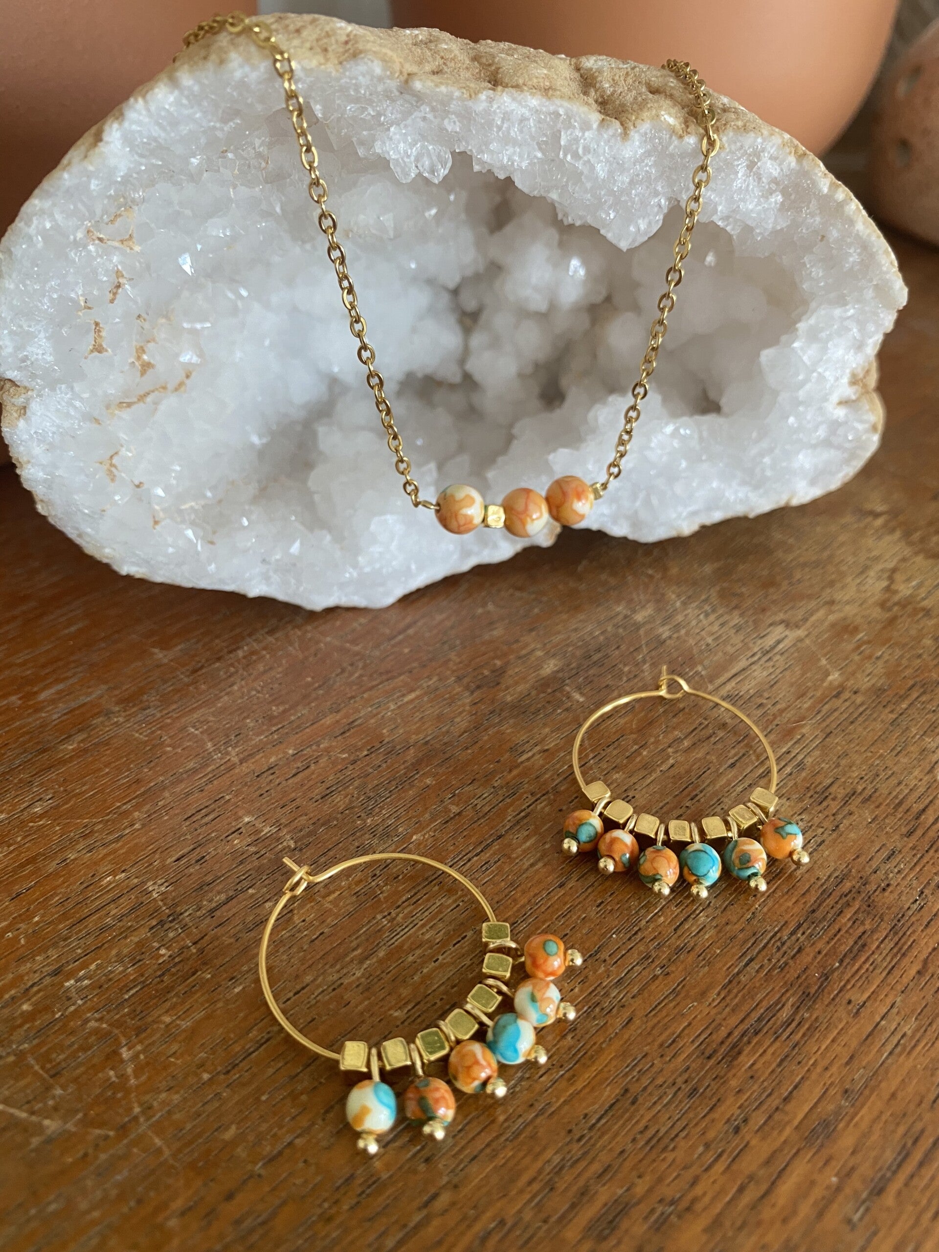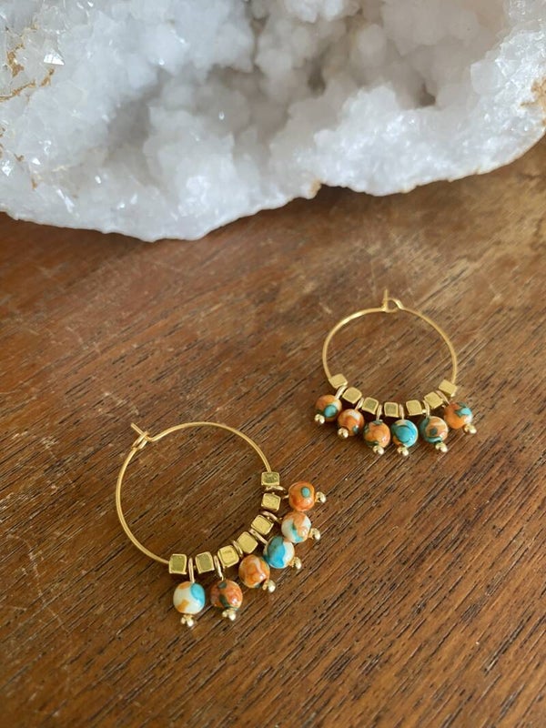 RVS 25 MM Hoops with 6 natural beads and 7 DQ cube beads